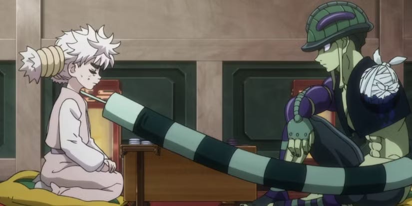 the final arc of the hxh anime has a very different vibe. it’s very killua-centric (which is excellent because i love killua), brings back the dynamic duo of illumi and hisoka (a sublime matchup, what complete freaks), leans heavily on political intrigue, and finally shows gon meeting his father, ging. a lot happens! paradoxically, it’s also the shortest arc of the show! it’s wild, because this is an arc i would have wanted to be longer, but instead it wraps up almost too quickly. it’s not my favorite arc of the show (that’s probably yorknew), but i liked it a lot; it benefits greatly from bringing the focus back to our main characters rather than random ant-human hybrids, and the chaos that hisoka always brings to any scene he’s in is so entertaining to watch. i also love the relationship between killua and his sister alluka; it’s so adorable to see killua in an older brother role.